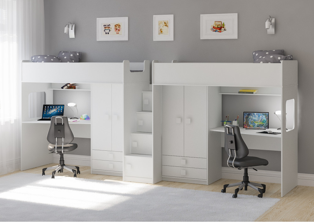 Под спальным местом для каждого ребенка располагается рабочее место с встроенным столом.
