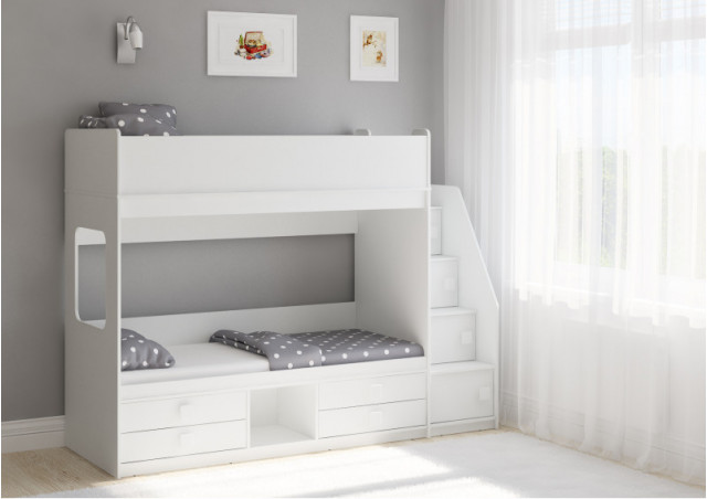 Классическая детская двухъярусная кровать с двумя параллельными спальными местами размером 1750х750 и 1900х750, выдвижными ящиками для хранения и угловой лестницей-стеллажем.