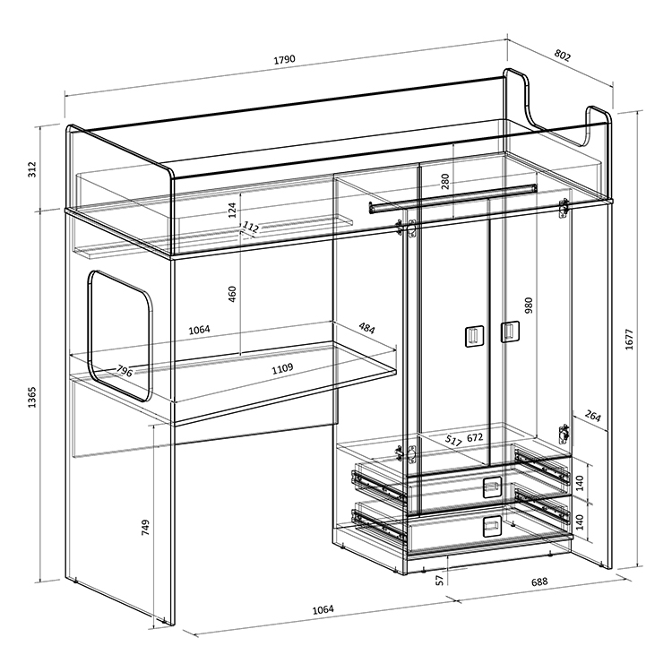 Учебная зона со столом под спальным местом открывает возможности для письменных работ,а также здесь удобно расположить ноутбук. Вместительная тумба Л-04 отлично подойдет для хранения канцелярских принадлежностей и учебников.